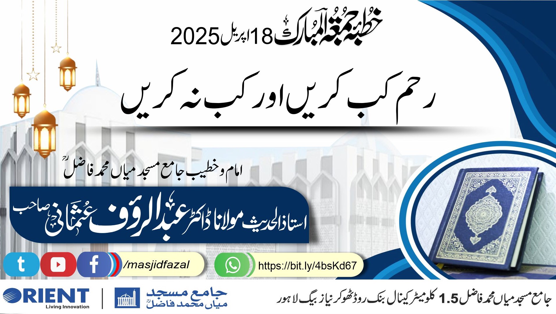 اسلامک سنٹر اینڈ جامع مسجدمیاں محمد فاضلؒ میں جید علمائے کرام تشریف لاتے ہیں ، ان کے بیانات، درسِ قرآن، درسِ حدیث اور خطبات جمعۃ المبارک اسلامک سنٹر کے سوشل میڈیا پر نشر کیے جاتے ہیں